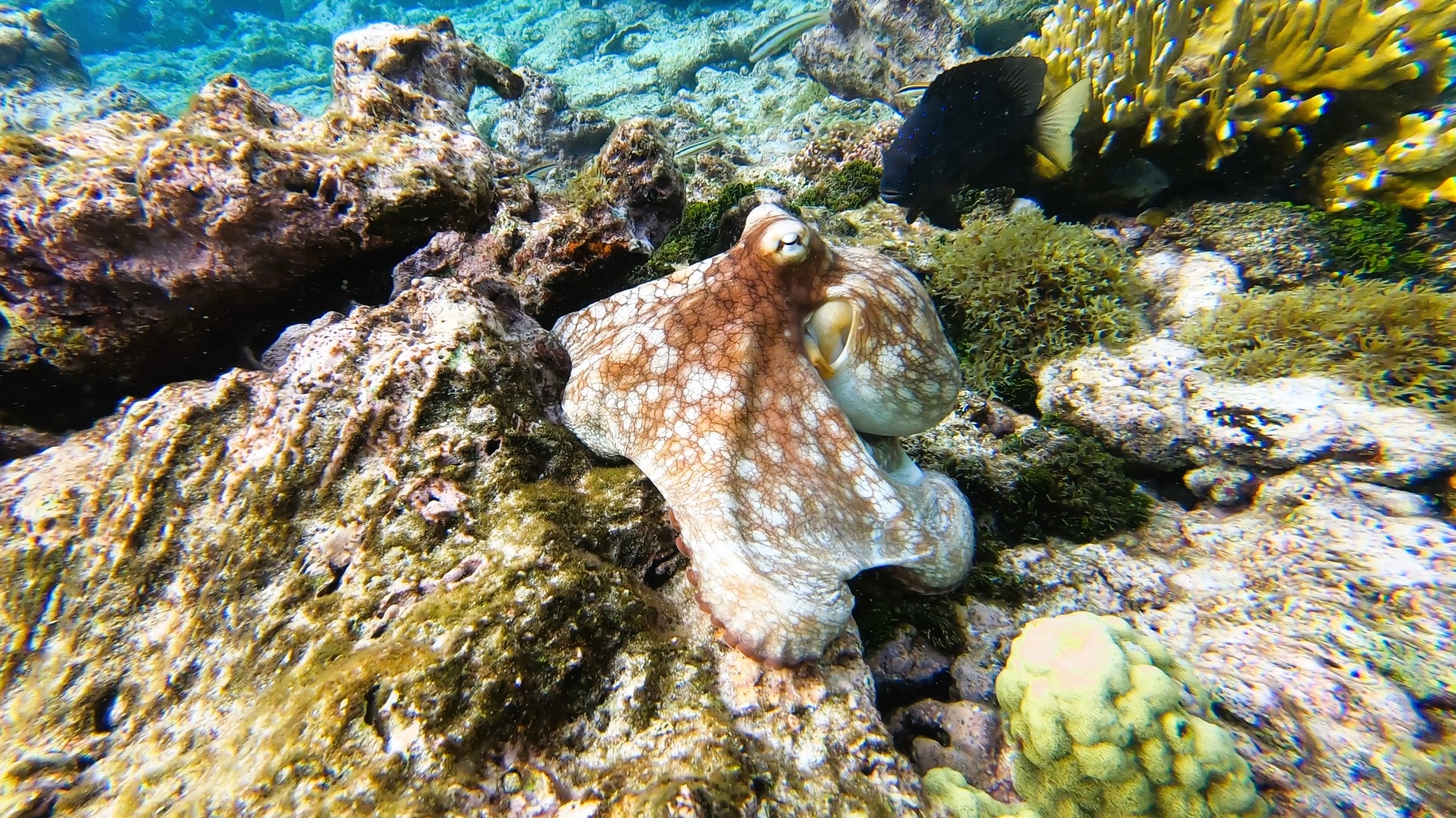 Much like swimming in an aquarium with crystal clear water, we encountered turtles everywhere, as well as sting rays, spotted eagle rays, nurse sharks, lemon sharks, white tip reef sharks, and even had a very memorable interaction with a friendly octopus.