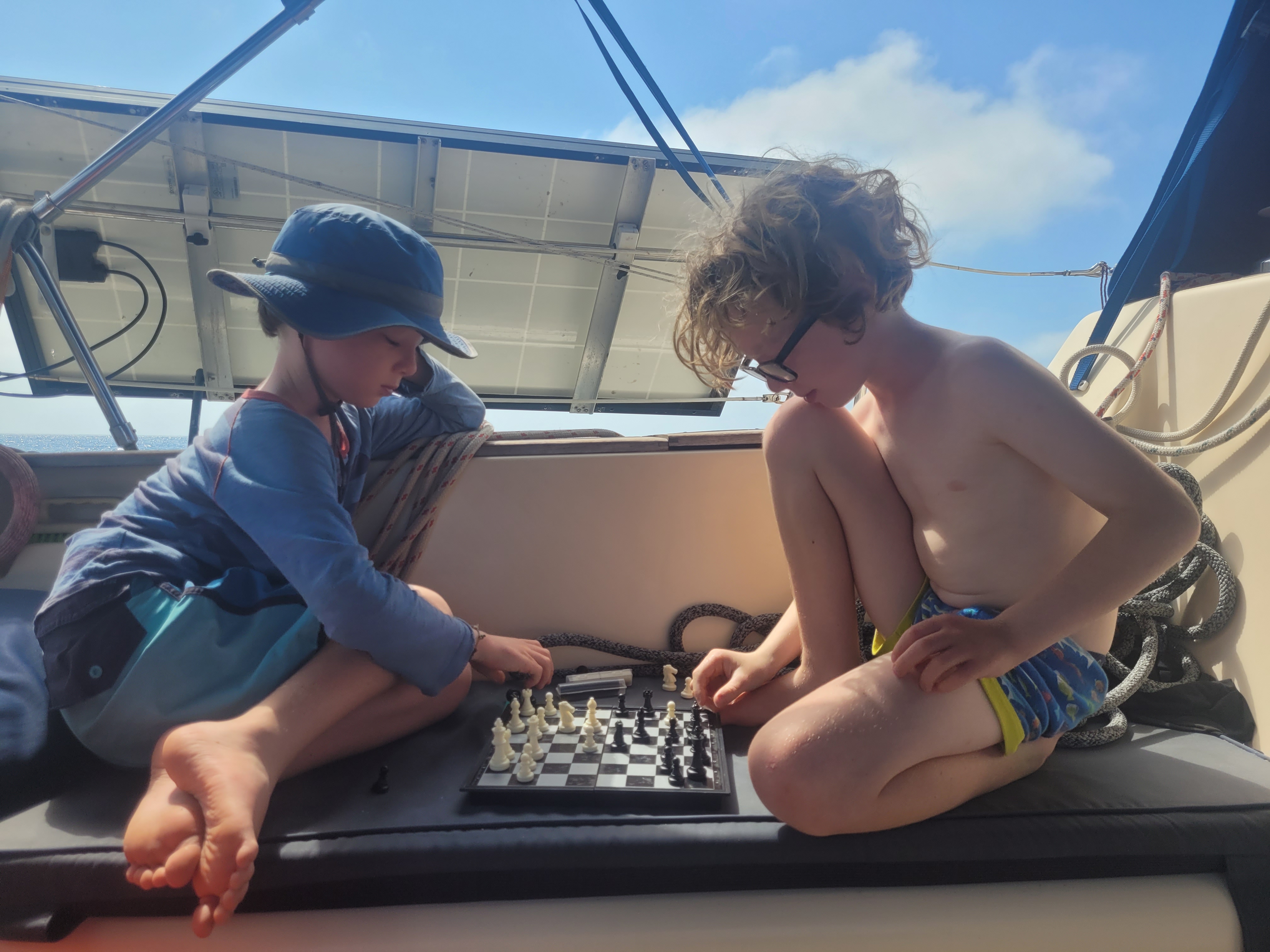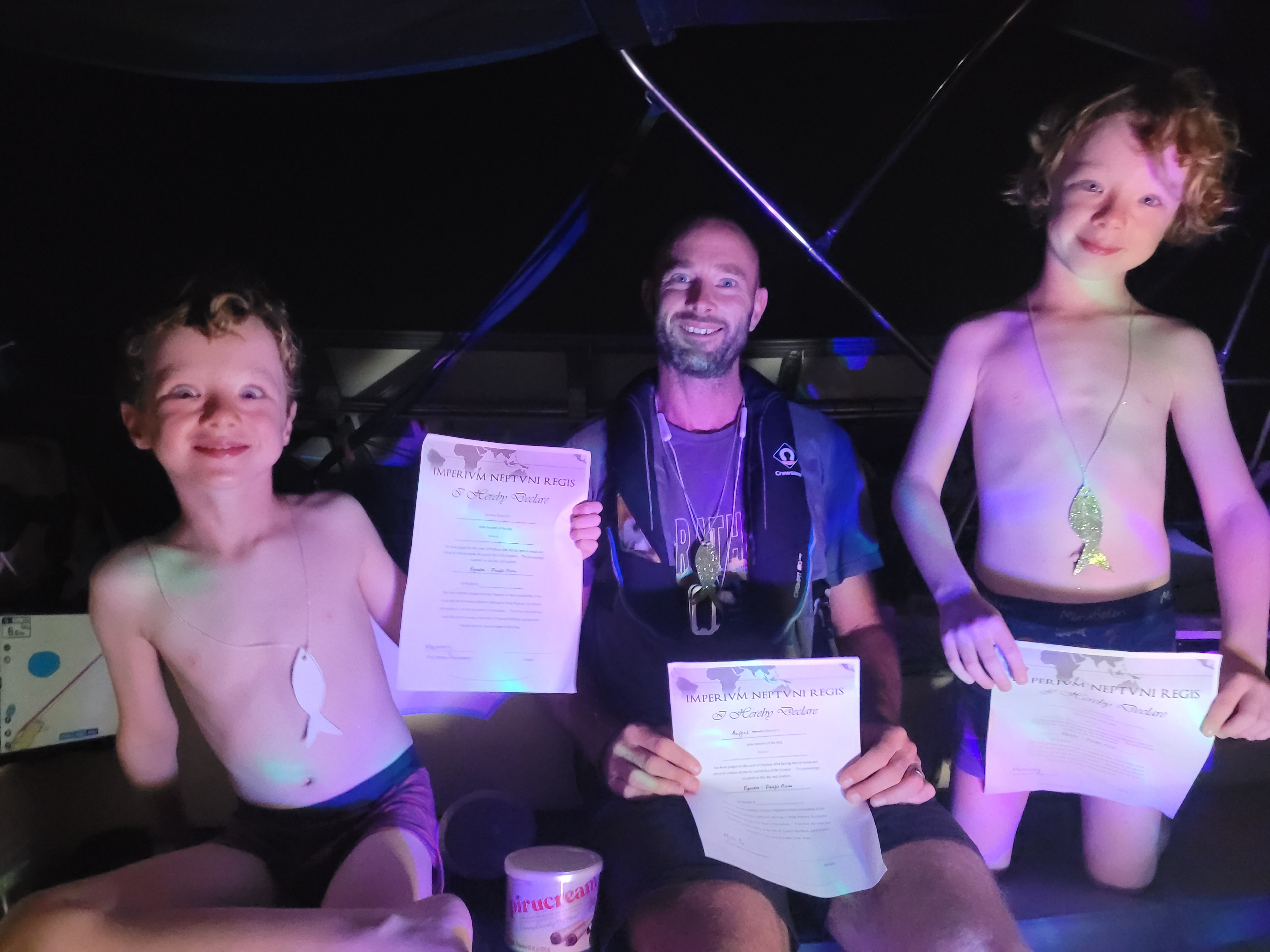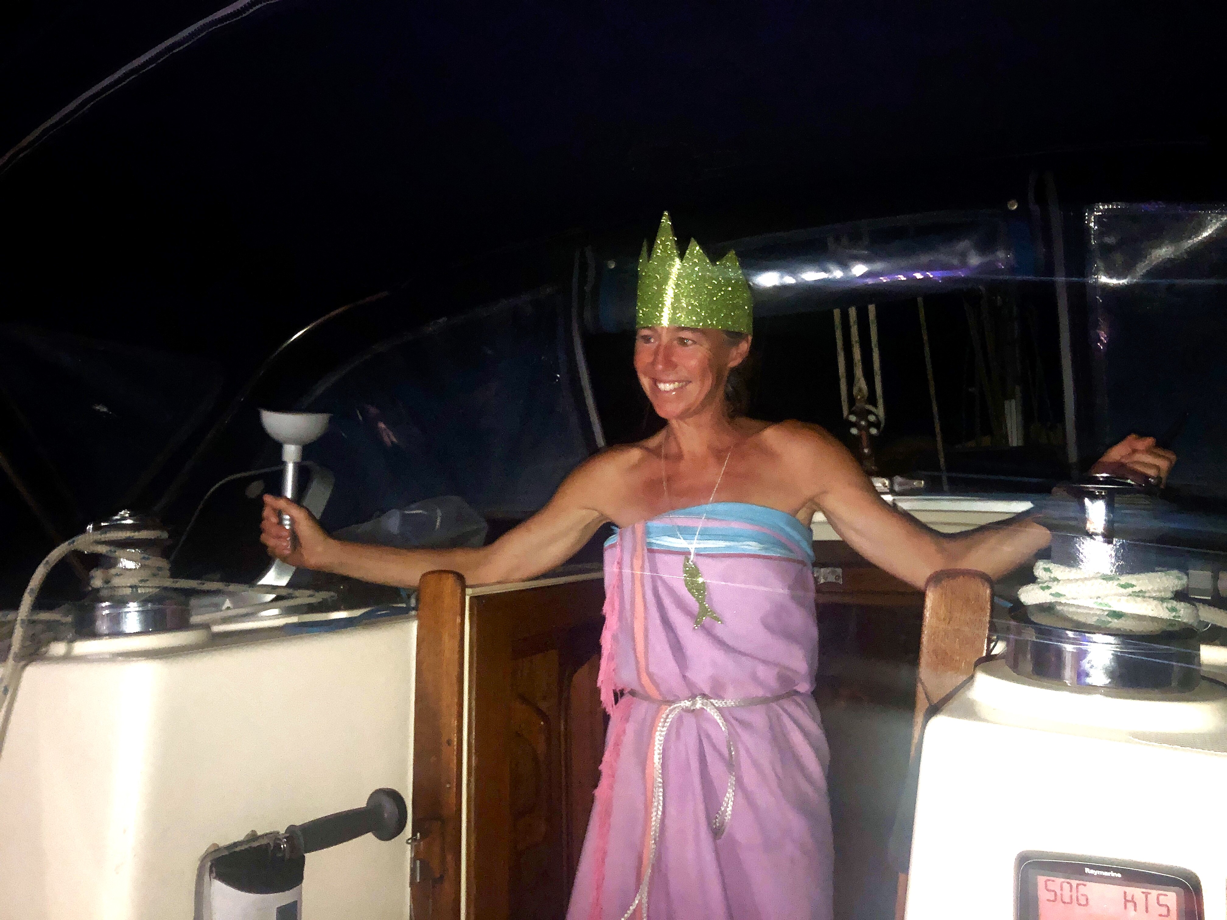Day 5 saw us crossing the equator at 00 00’N/S, 088 24’W, into the Southern hemisphere. A 400-year-old seafaring tradition holds that a line crossing ceremony commemorates a sailor’s first transit of the equator. Those who have crossed the equator previously are known as ‘Shellbacks’ and play the role as King or Queen Neptune, whilst first-timers are known as ‘Pollywogs’. As a veteran Shellback, Queen Neptune Zoe, equipped with a sink plunger in lieu of a sceptre, initiated Angus, Barnaby and Zennor into the mysteries of the deep….