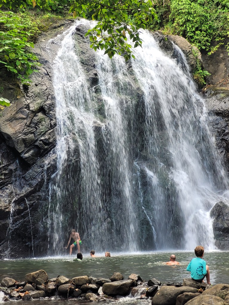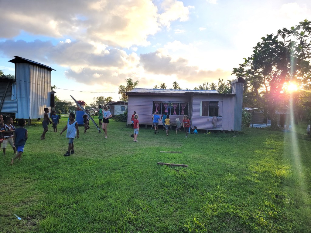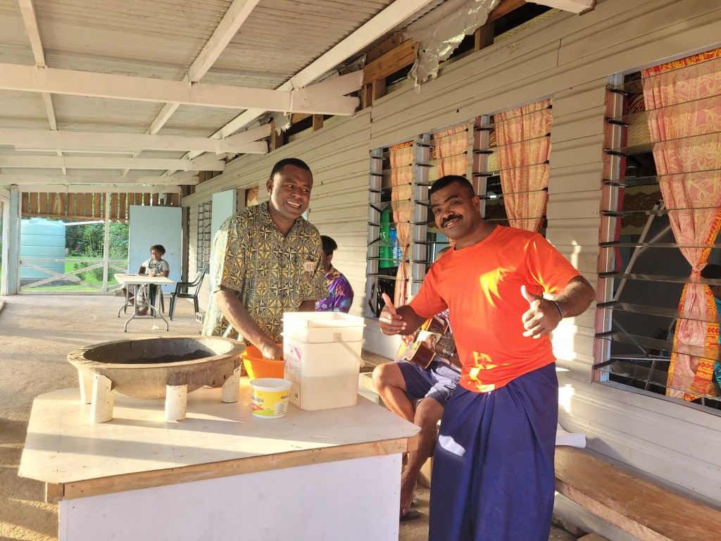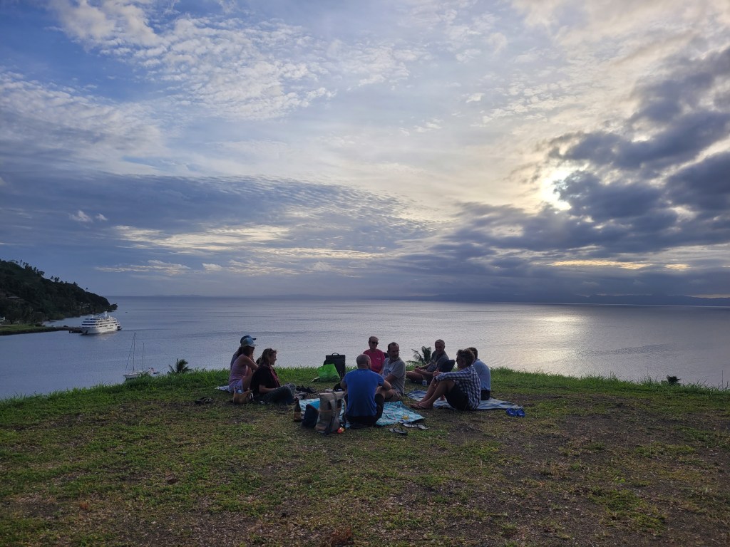 We also had a memorable day out at the Vuadomo Waterfall. We hiked along a dusty track in lush vegetation to reach the nearby village where we were granted permission to visit the falls. Post-swim, we were invited back to the village where our mob of boat kids joined the local kids playing football and long jump, whilst the adults were invited to partake in a kava ceremony. Kava, banned in most European countries, is the traditional national drink of Fiji. It is made from the crushed roots of the yaqona plant and once processed resembles muddy water. It tastes ‘unusual’ and has a mild numbing effect on the mouth. It is served in a large communal bowl from where it is dished out to each of us in turn in a half coconut shell. After a few rounds, we were serenaded by the community, culminating in the mournful, ‘nisa lei’, or goodbye song. Like many of our subsequent encounters in Fiji, we were humbled and moved by the generosity and warmth of our new Fijian friends.