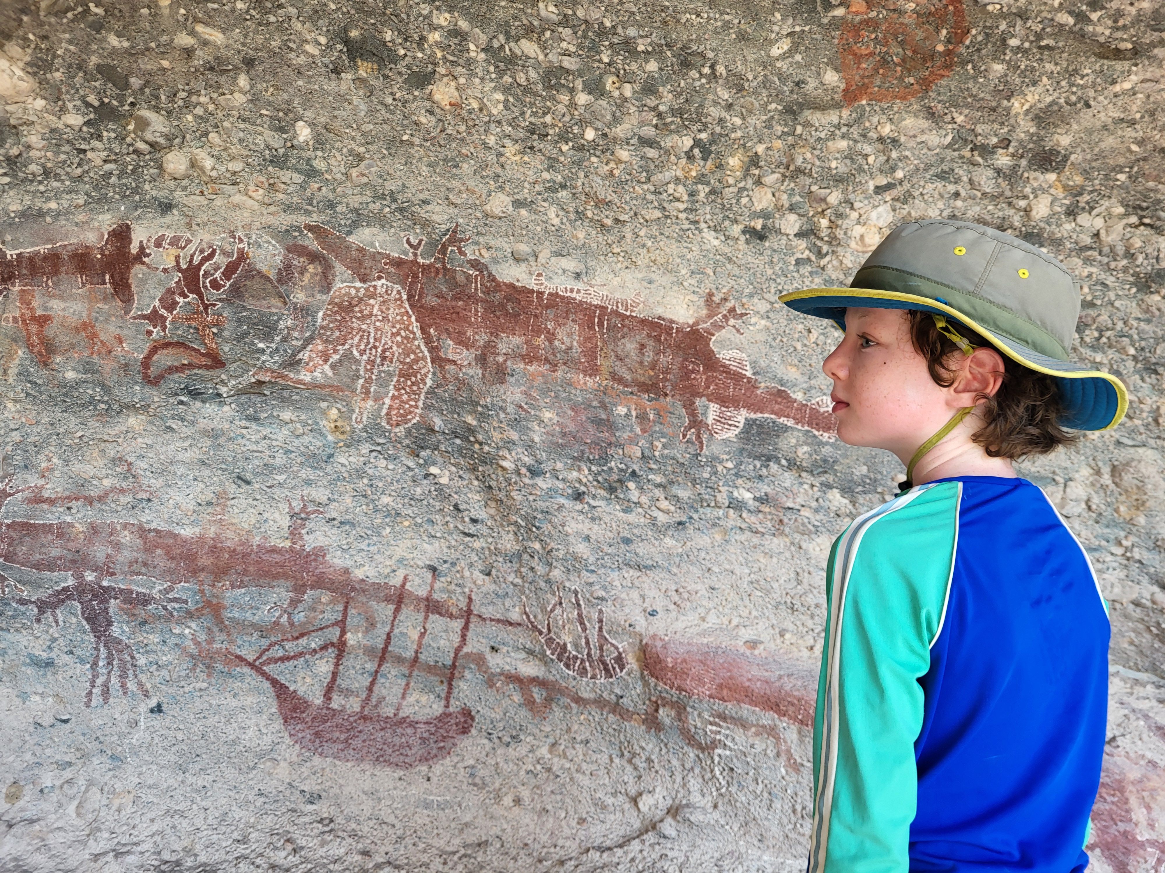 From Seisia we headed North and rounded the tip of the peninsula, anchoring briefly at Cape York, and running ashore to photograph the bullet hole riddled sign that marks the northernmost point on the Australian continent. Back aboard we pushed on to Shallow Bay in Albany Pass and waited until midnight when the current was set to turn in our favour. The passage southwards was pretty brutal, again sailing in to the full force of the trades. After 24 hours we stopped in Margaret Bay just for a moment’s respite from the violent motion, and to be able to make pancakes to cheer up the crew before heading out again. The following morning, we anchored briefly off Portland Road where we got a few hours sleep, before anchoring for the night in the appropriately named Night Island anchorage. 24 hours later we arrived at Flinders Island where we went ashore to visit some of the world’s oldest cave art.