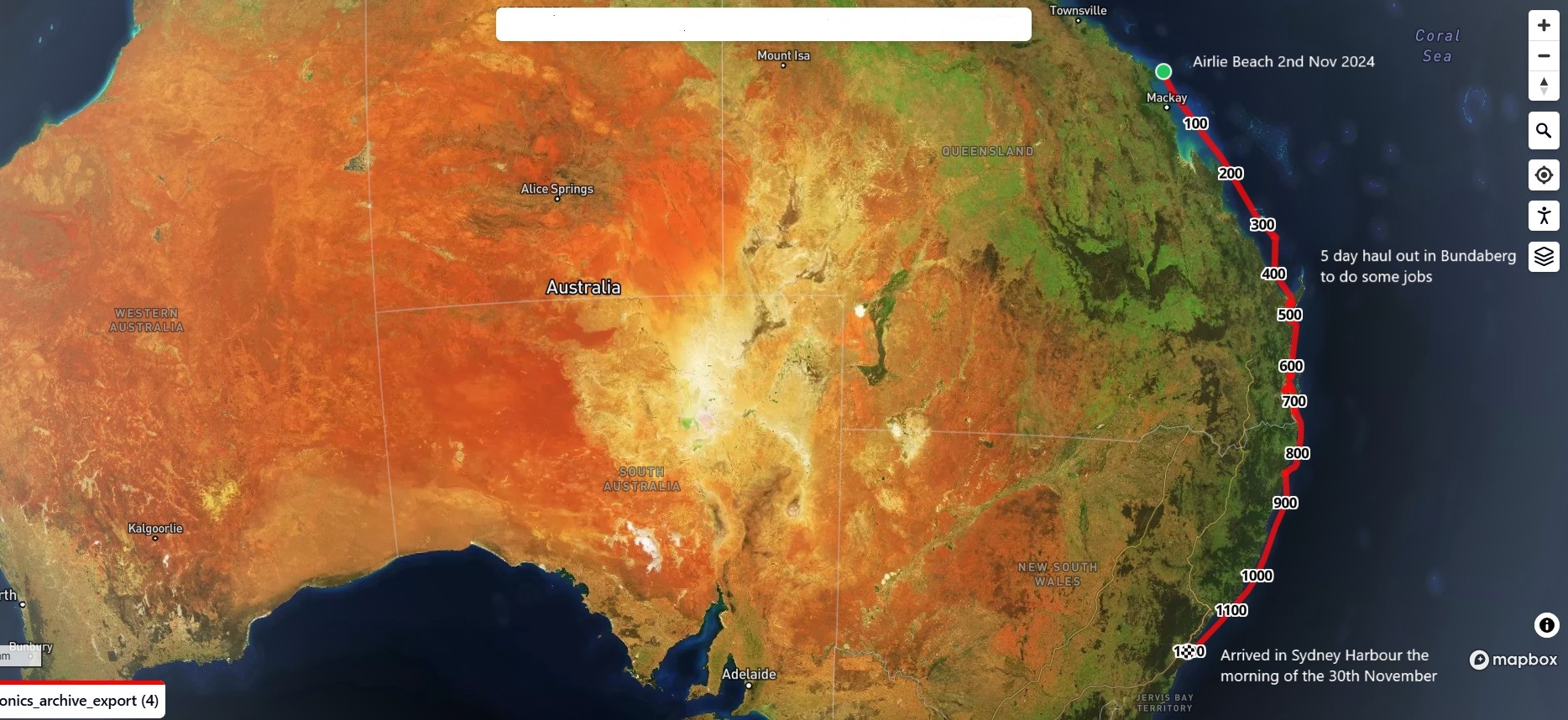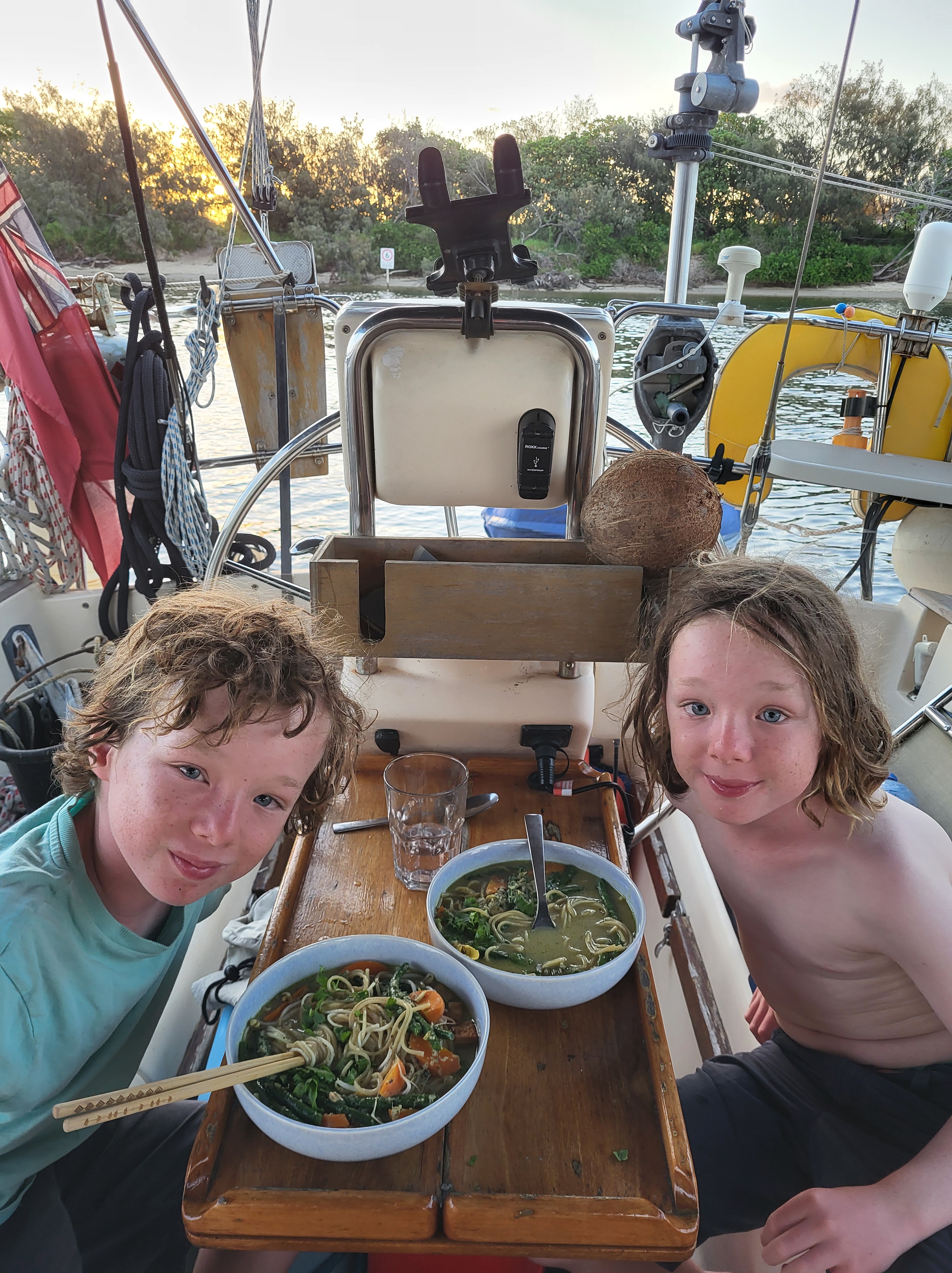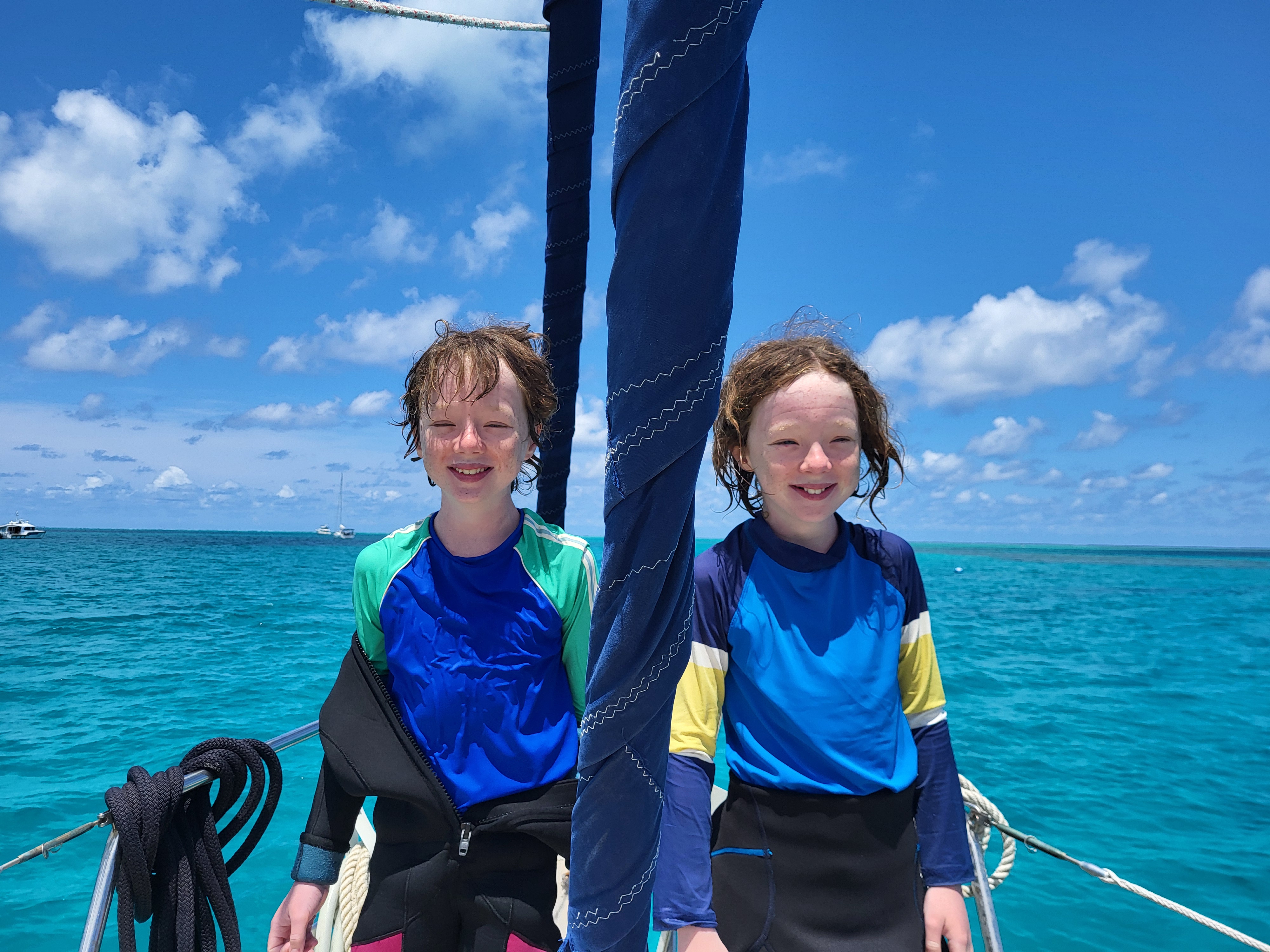 We splashed Mowzer on 13th November to continue our passage South. An overnight stop at Susan River, River Heads, then a quick dip in the jacuzzi at the Kingfisher Resort on K’gari before heading onwards to Turkey Island for the night. At dawn, we continued southwards through the Great Sandy Strait before taking a beating as our staysail jammed in a squall as we approached Inskip Point. Meanwhile friends ran aground on a sandbar in their 60ft catamaran.