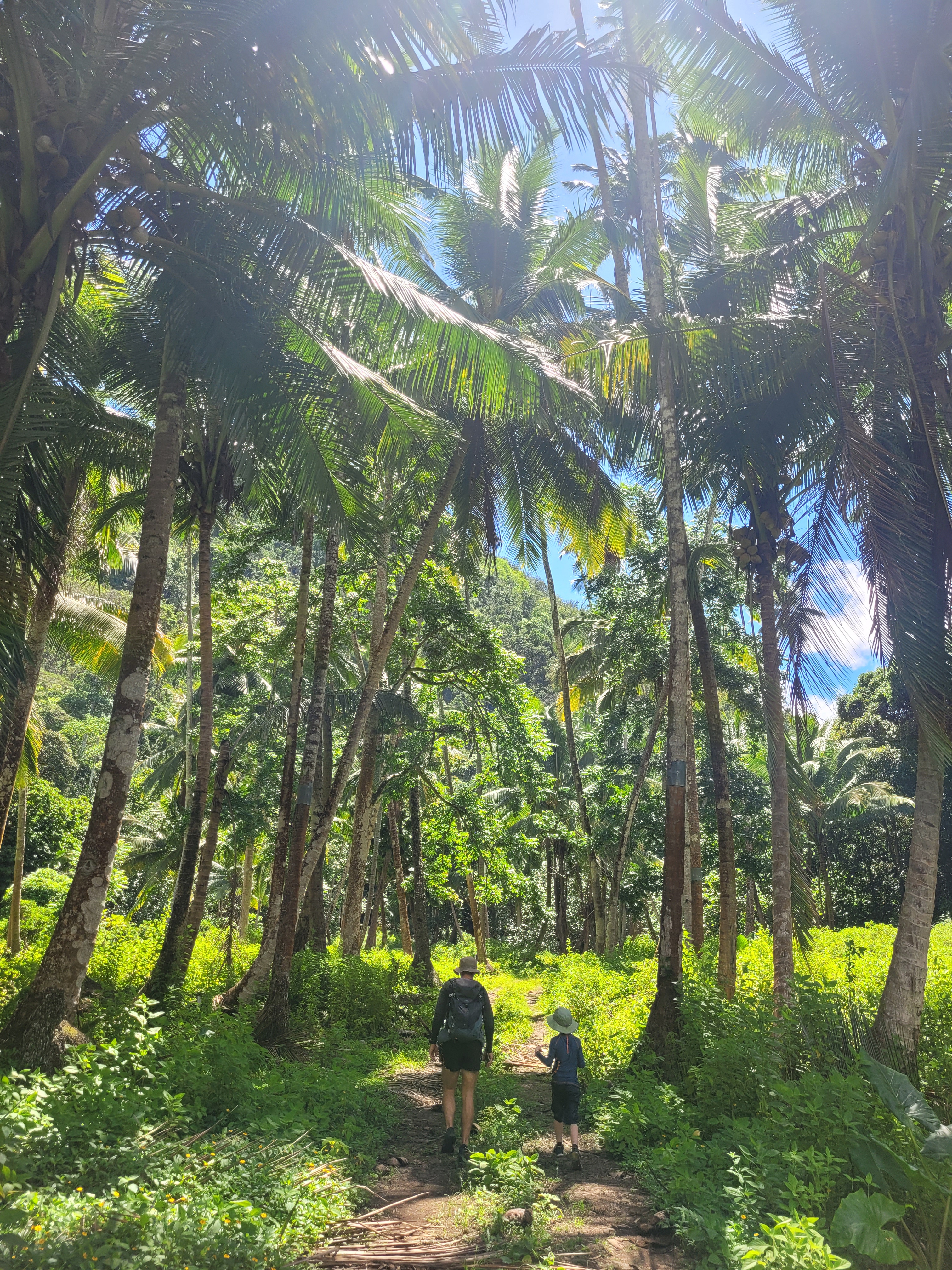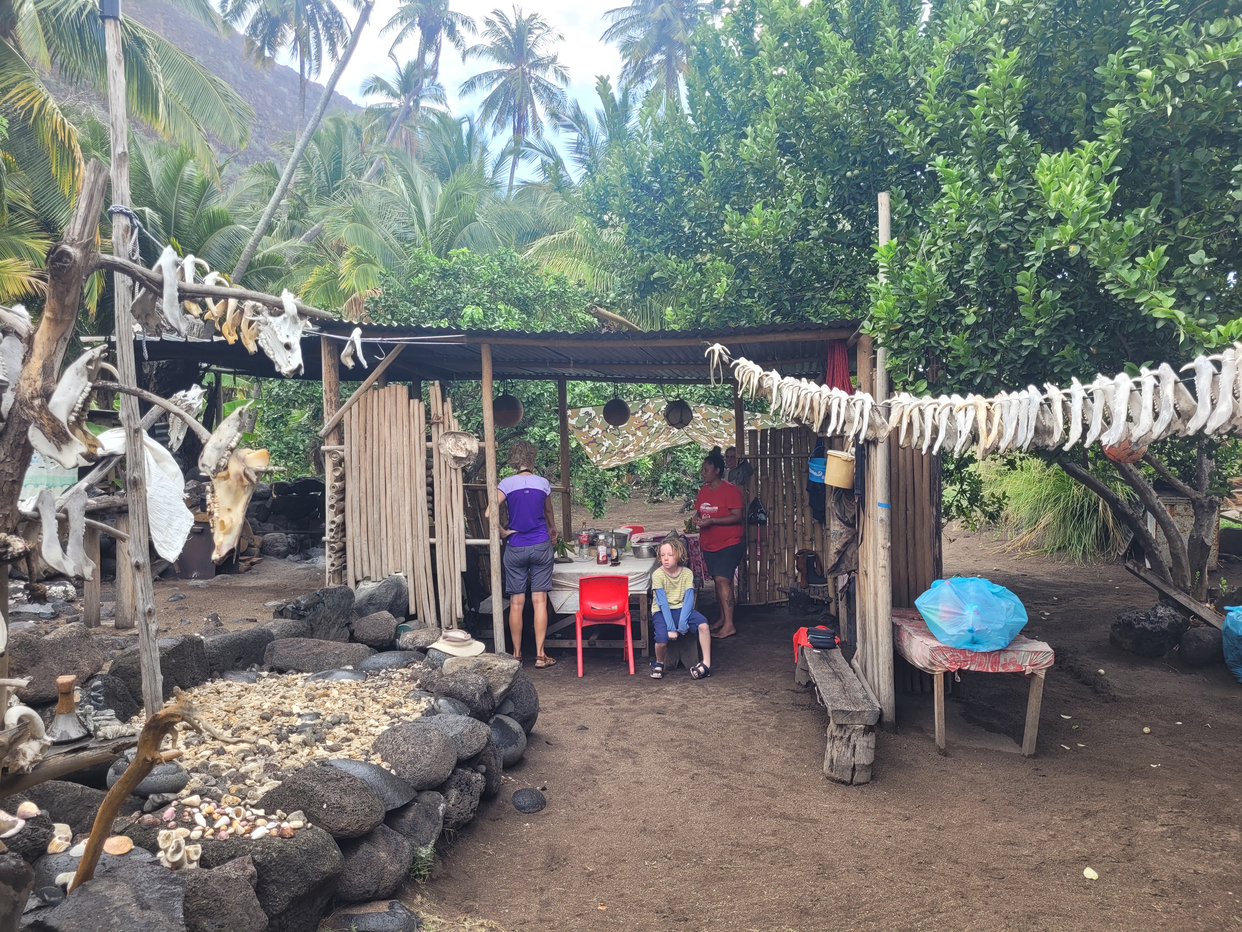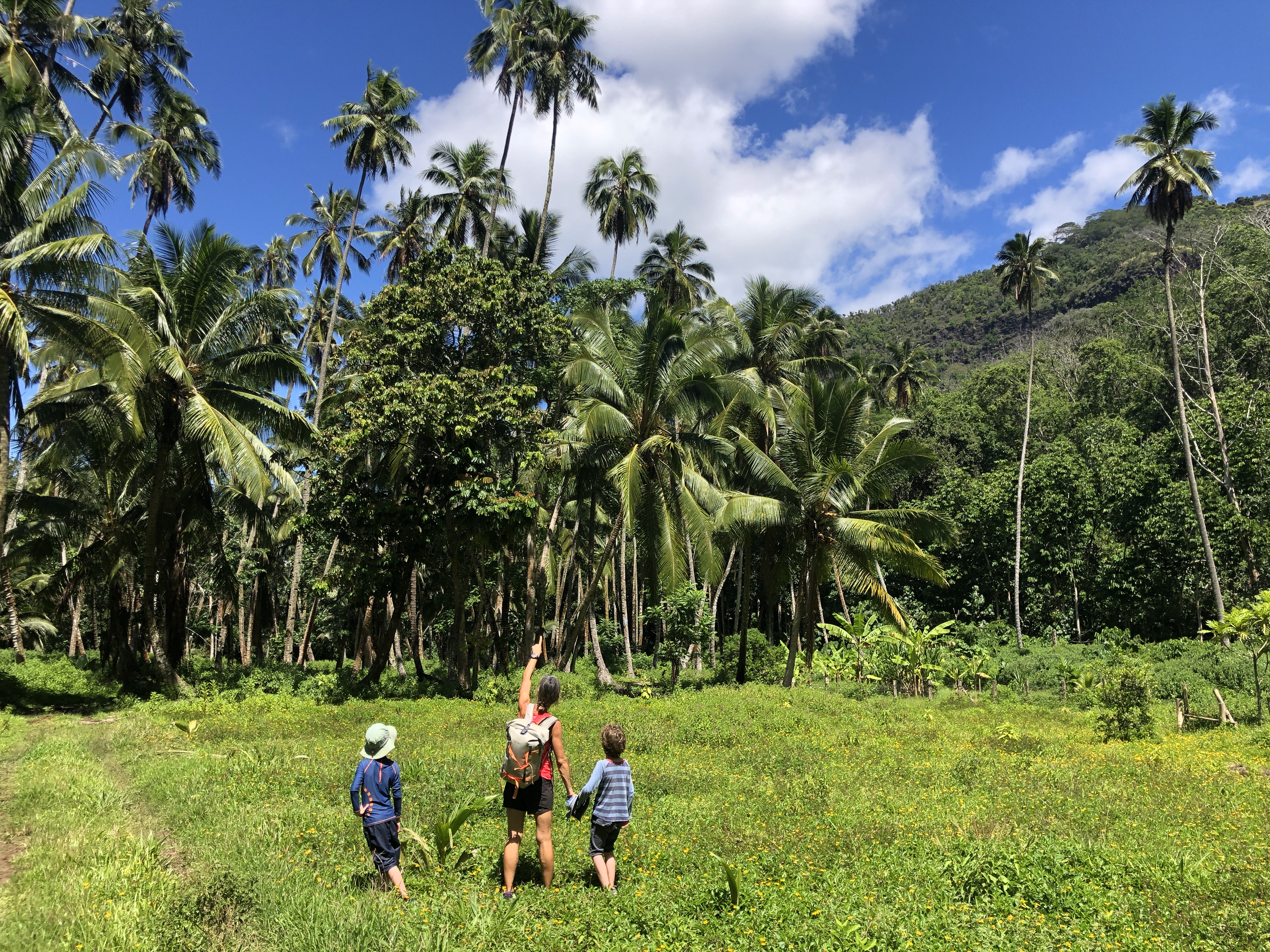 During our stay, we hiked east to the neighboring windward bay of Haataivea, known for its wild beach and standing stones. On our way back to the anchorage, we encountered a family on horseback who kindly agreed to sell us some of their produce. They took us to their fields, where they harvested melons, cucumbers, basil, papaya, and rambutan for us.