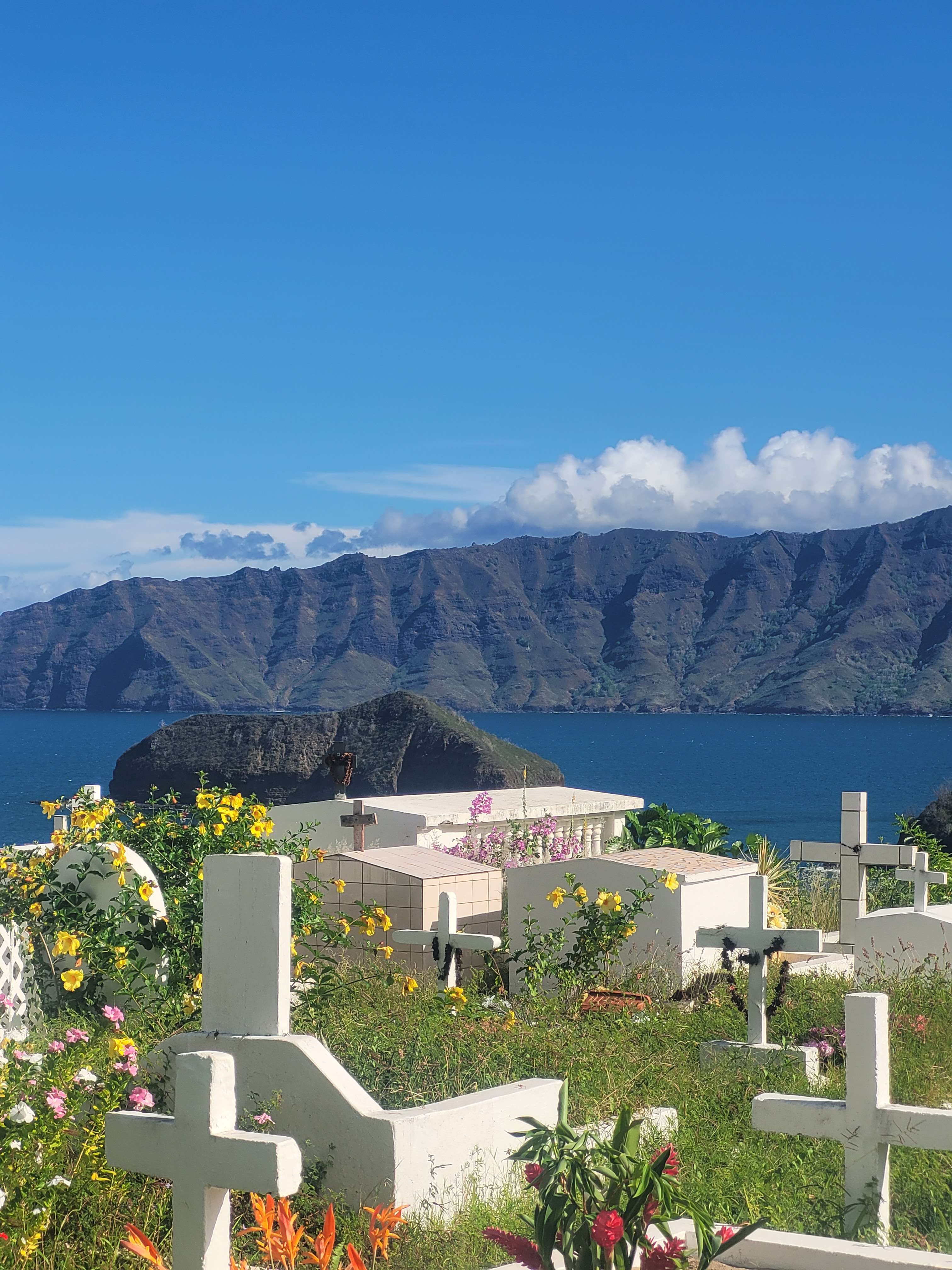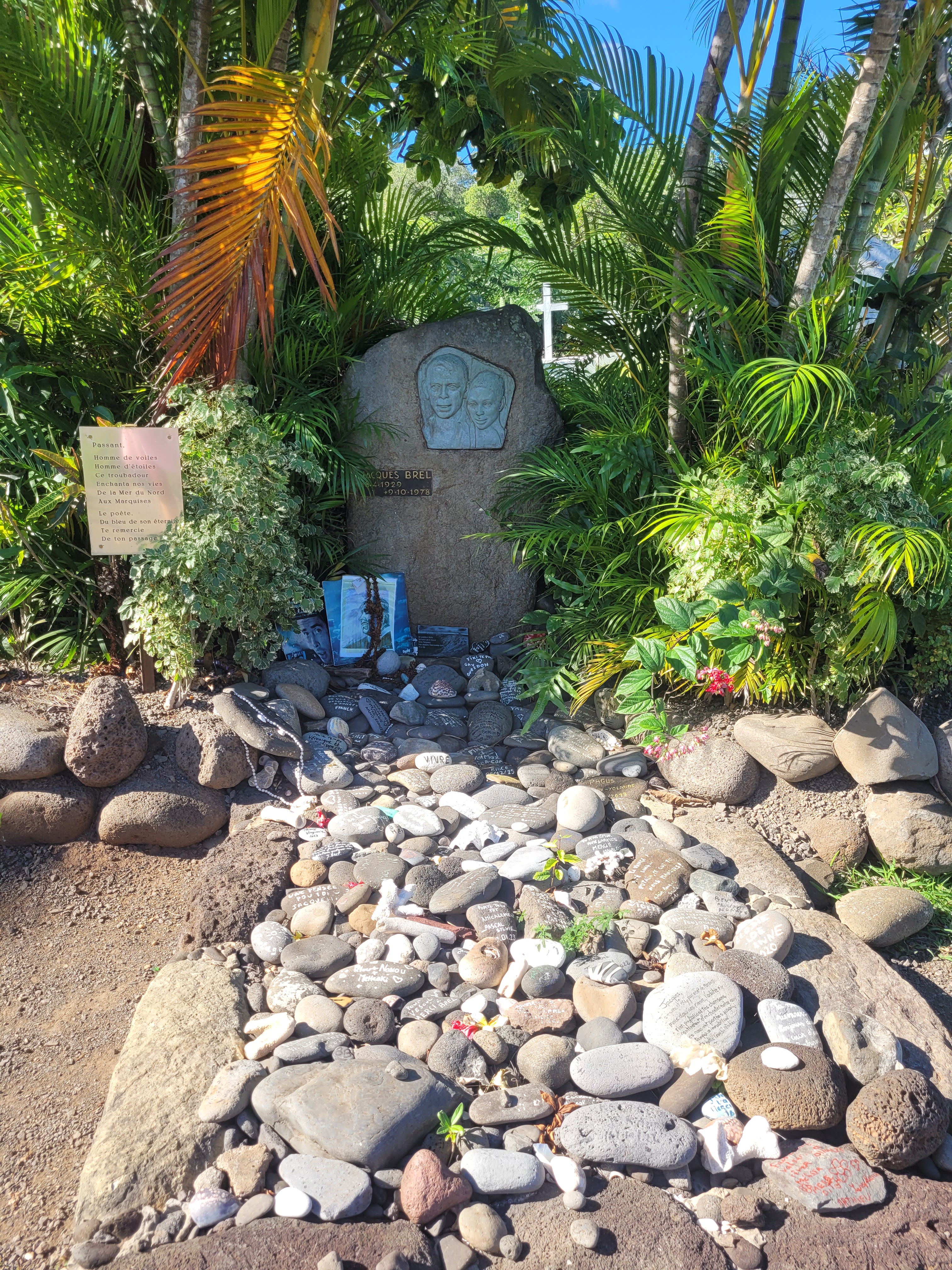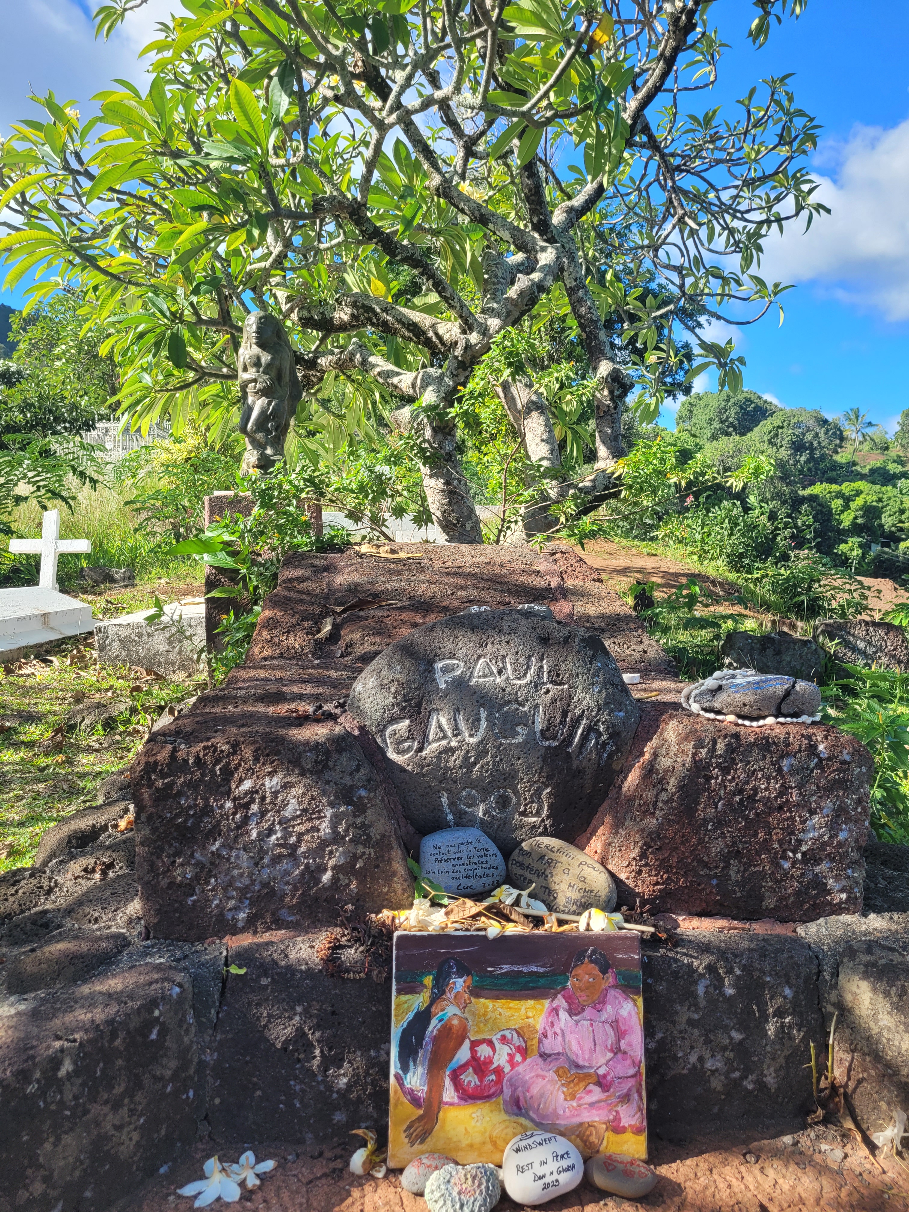 Hiva Oa holds a unique allure as the final resting place of two remarkable artists, Jacques Brel and Paul Gauguin. We paid our respects at their graves, nestled in the peaceful Atuona cemetery, shaded by fragrant frangipani trees and overlooking the boundless expanse of the Pacific Ocean. One can’t help but appreciate the beauty of their eternal resting place.