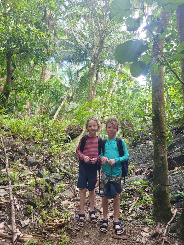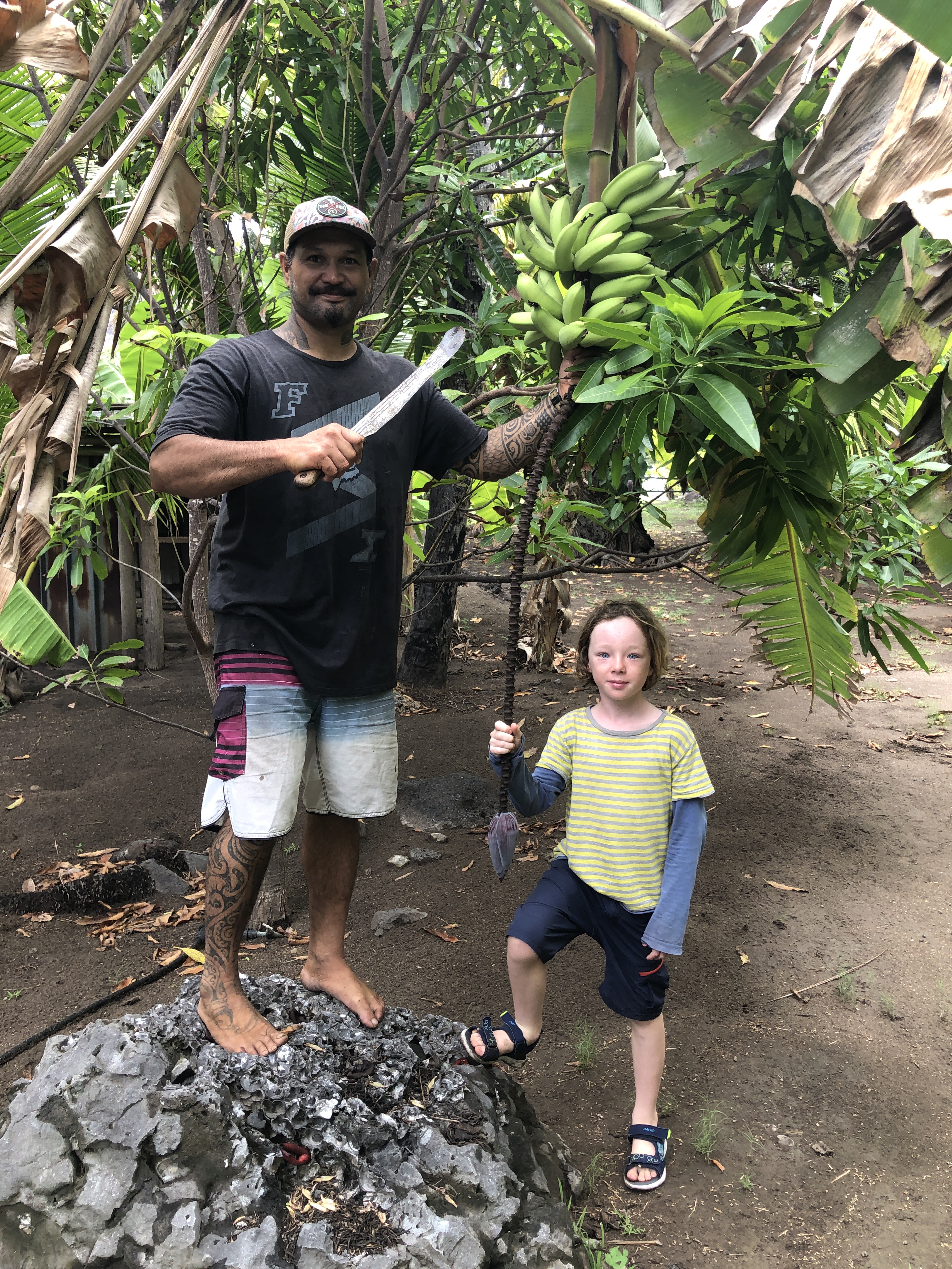 Continuing our journey along the coast, we arrived at the idyllic Hanamenu Bay anchorage, where we were joined by friends aboard Wild Thing 2. Together, we embarked on a breathtaking hike to the volcanic ridge, offering awe-inspiring vistas of the anchorage below. Our adventure also led us to meet the valley’s sole inhabitants, Tepua and Josephino, who, like their ancestors, sustain themselves by farming coconuts, hunting wild boar, and crafting intricate carvings to share with passing sailors. Their warm hospitality extended to inviting us for lunch and a refreshing swim in their natural freshwater pool. As we bid them farewell, we left with bundles of ripe bananas, plantains, and bags brimming with wild watercress.