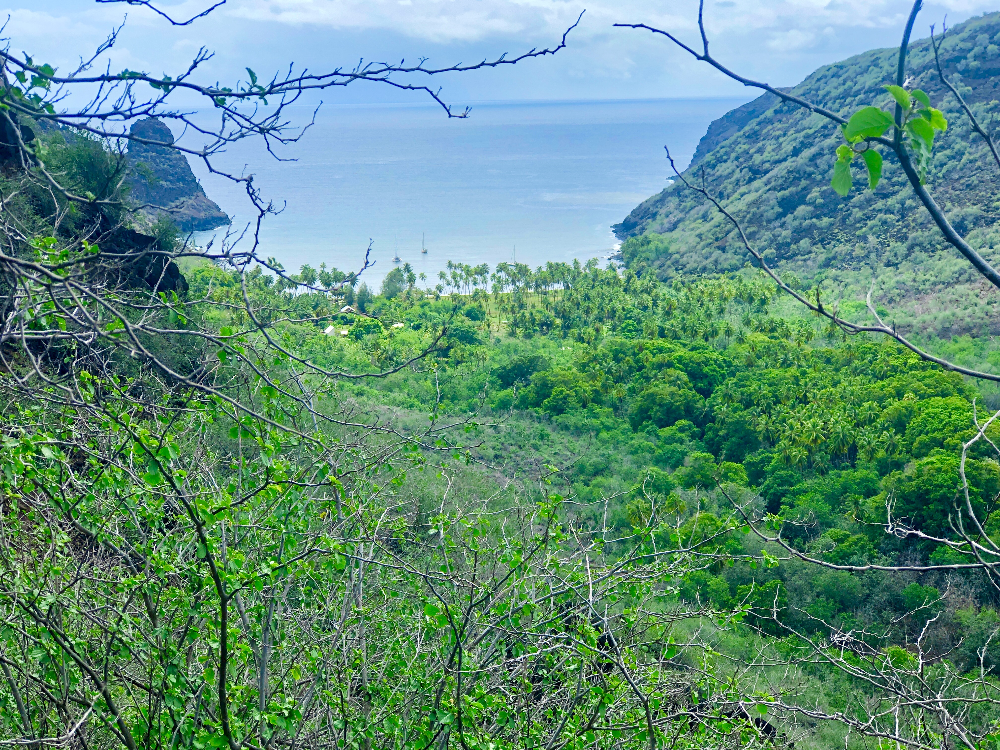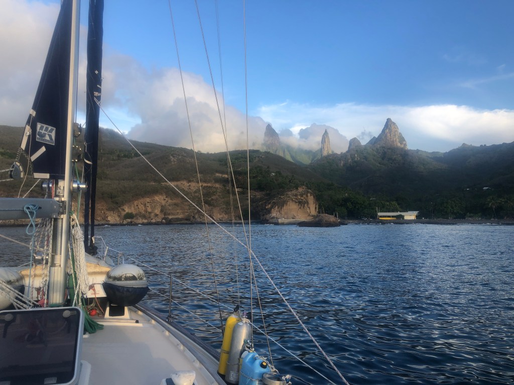 From Taihoae, we sailed 20 nautical miles along the coast to Anaho Bay, one of the most breathtaking anchorages we’ve encountered during our travels. Multiple white sandy beaches were nestled among coconut groves and frangipani trees, all surrounded by dense, lush jungle that stretched up to epic basalt spires.